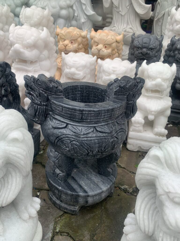 Ngược lại với sắc trắng thanh khiết, lư hương đá đen mang trong mình vẻ đẹp huyền bí, trầm mặc và đầy uy nghiêm. Lư hương đá đen thường được chế tác từ các loại đá xanh đen tự nhiên. Sắc đen tượng trưng cho sự vững chãi, bền bỉ, quyền lực và sự trường tồn. Trong phong thủy, màu đen còn có khả năng hấp thụ năng lượng tiêu cực và bảo vệ không gian khỏi những yếu tố xấu xa.